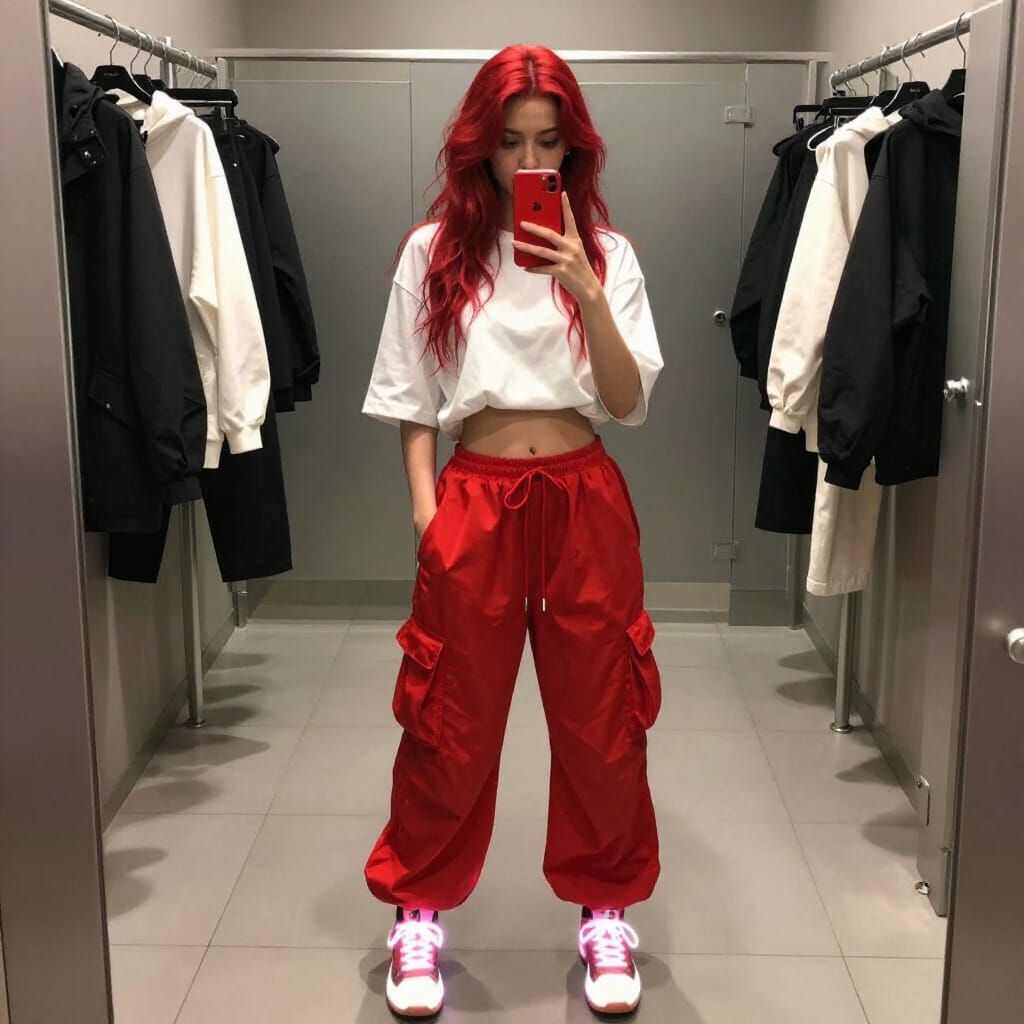 This hyperdetailed image captures a woman with long red hair taking a mirror selfie in a fashion store bathroom, holding a phone. The scene features ethereal mist and glowing elements.