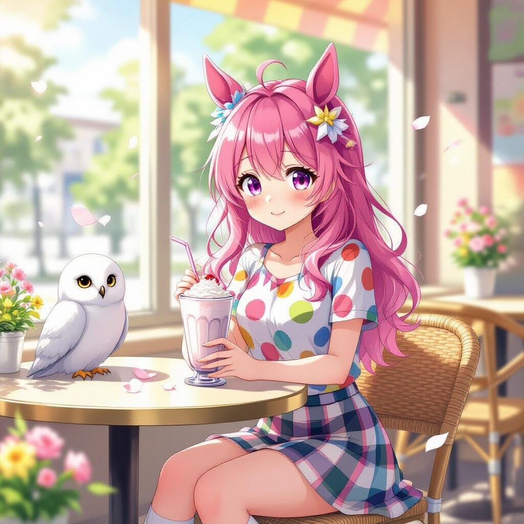 This anime-style drawing features a vibrant pink-haired girl with horse ears enjoying a milkshake at a cafe table. Sunlight streams in, with petals scattering outside. A white owl rests beside her. Rendered in a dynamic, high-energy cel-shaded style.