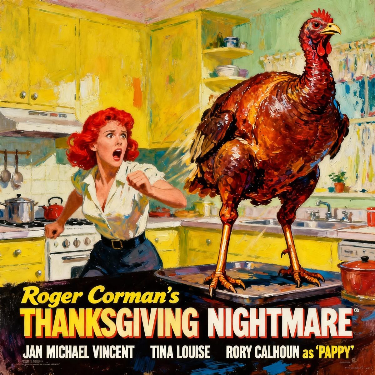 A 1970s-style movie poster featuring an impressionistic oil painting of a woman fleeing a monstrous cooked turkey, reminiscent of pulp magazine art.