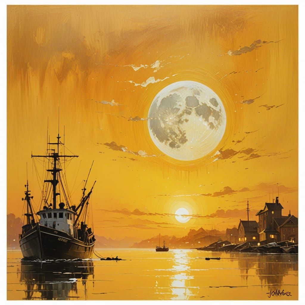Vibrant oil painting. Close up. Fishing boat in the harbour of a fishing town with a huge golden 88 hour gold moon, Jko sky. Oil splash, ink splash, fluid gouache illustration. Dramatic, volumetric lighting with warm hues. Inspired by Ed Blinkey, Jeremy Mann, and Greg Manchess. Best quality, trending ...