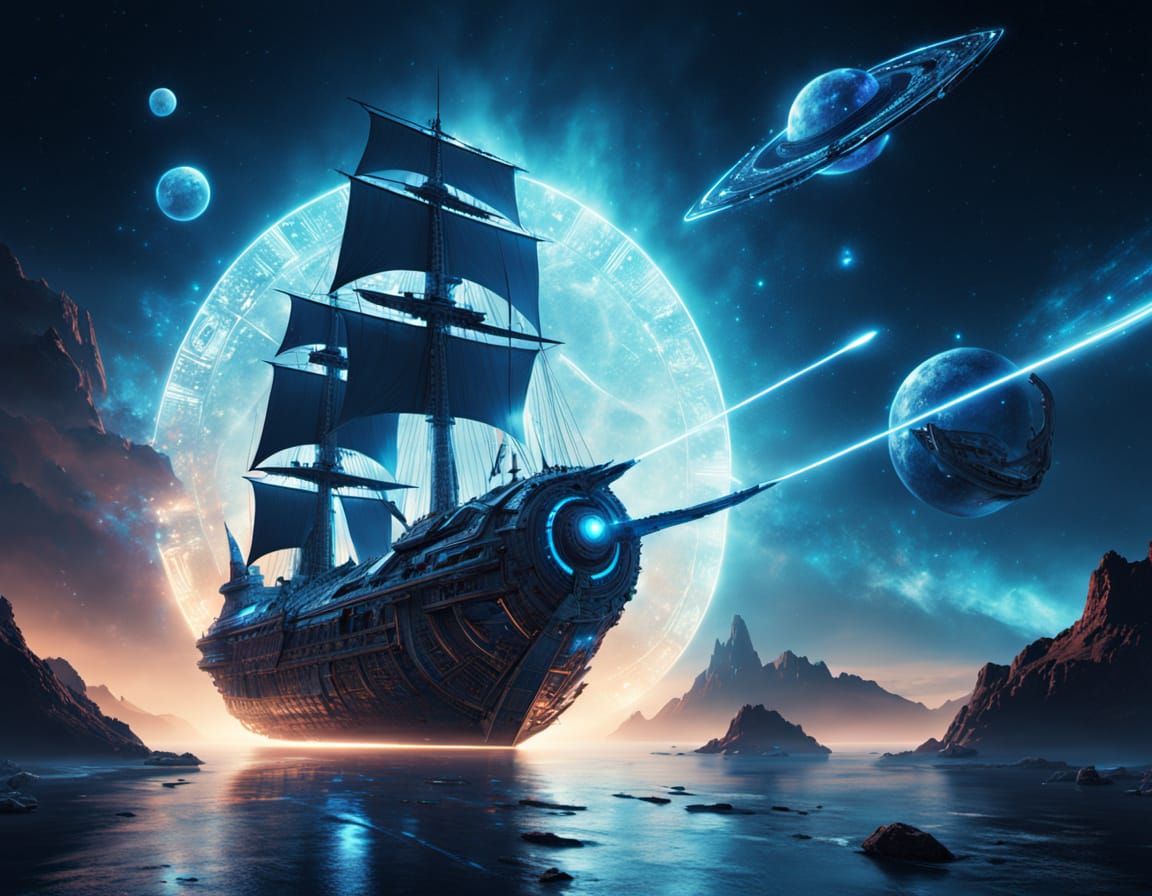 This image shows a futuristic, ancient-futuristic fusion of a Phoenician warship reimagined as a space pirate vessel, with a sleek, curved hull of aged bronze and cosmic alloy, glowing plasma sails, and laser cannons.