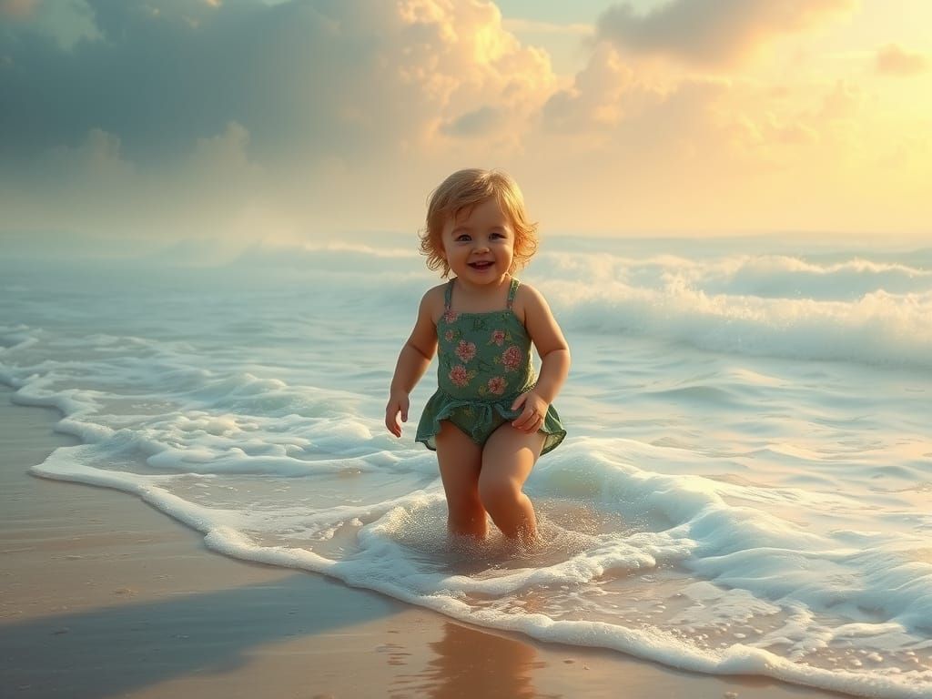 This image shows a happy toddler in a bathing suit wading at the sea's edge, surrounded by hyperdetailed, ethereal mist in the style of Thomas Kinkade.