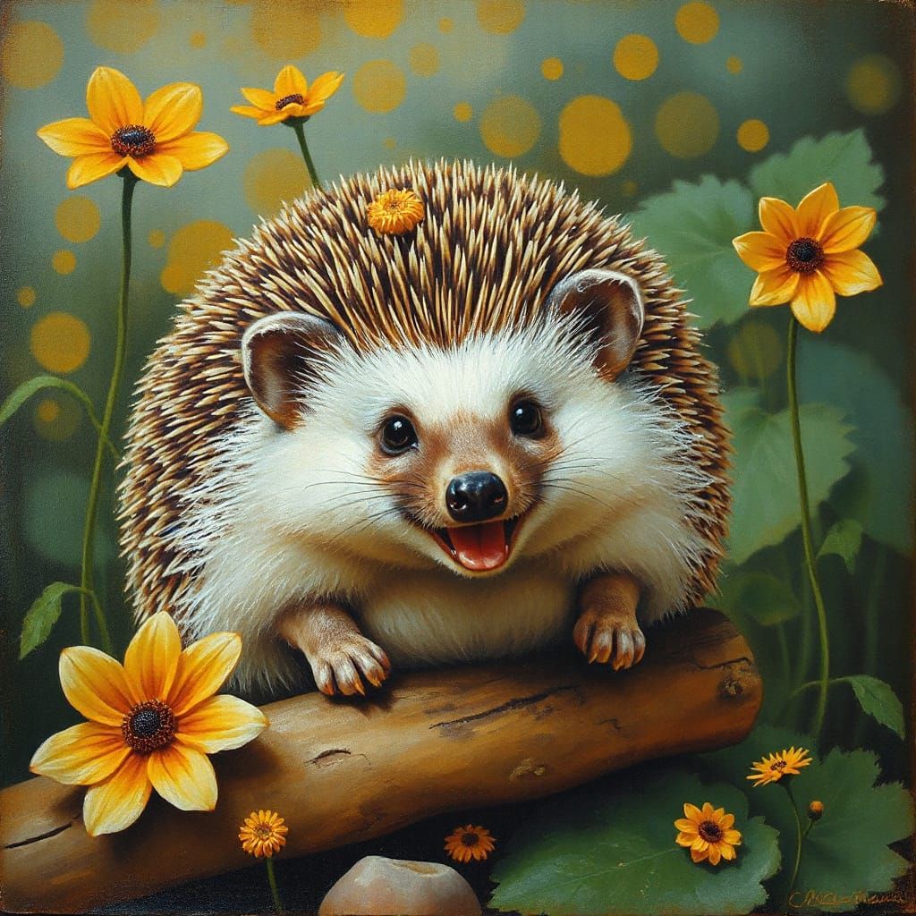 A vibrant airbrush art piece depicting a hedgehog's whimsical adventures. The artwork blends elements of impressionism and Klimt's gilded style.