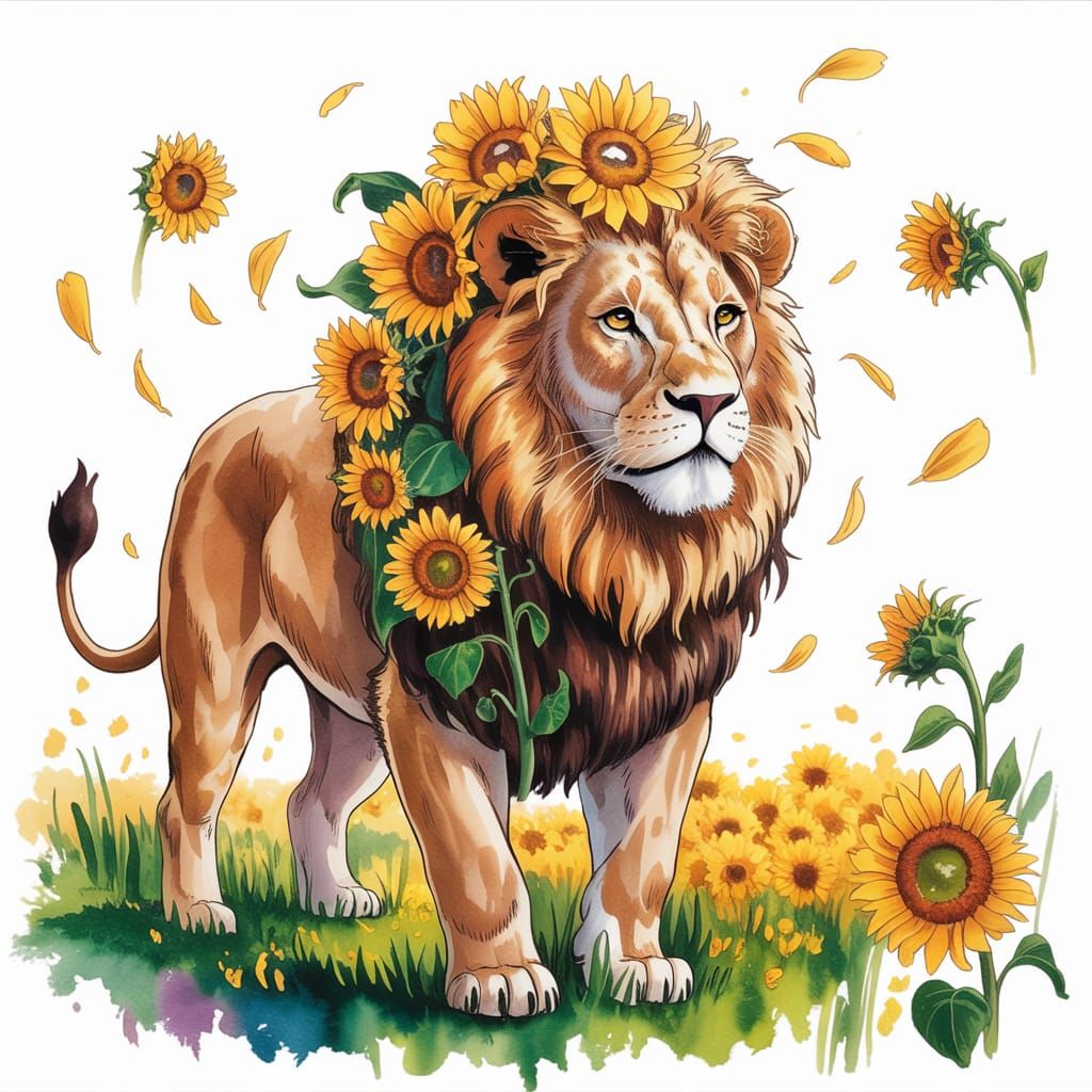 A striking picture of a majestic lion standing in a field. The lion's mane is made of sunflowers, with petals falling in the soft lighting of a dreamy, whimsical watercolor.