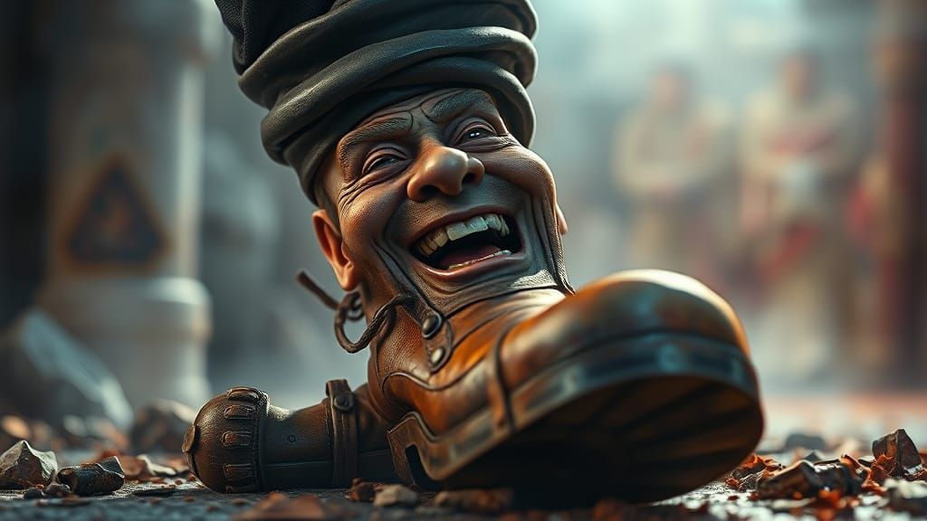 This stunning oil painting showcases a whimsical old boot with a joyful expression, rendered in exquisite detail and depth, with vibrant colors and luminous gradients that create a cinematic atmosphere.