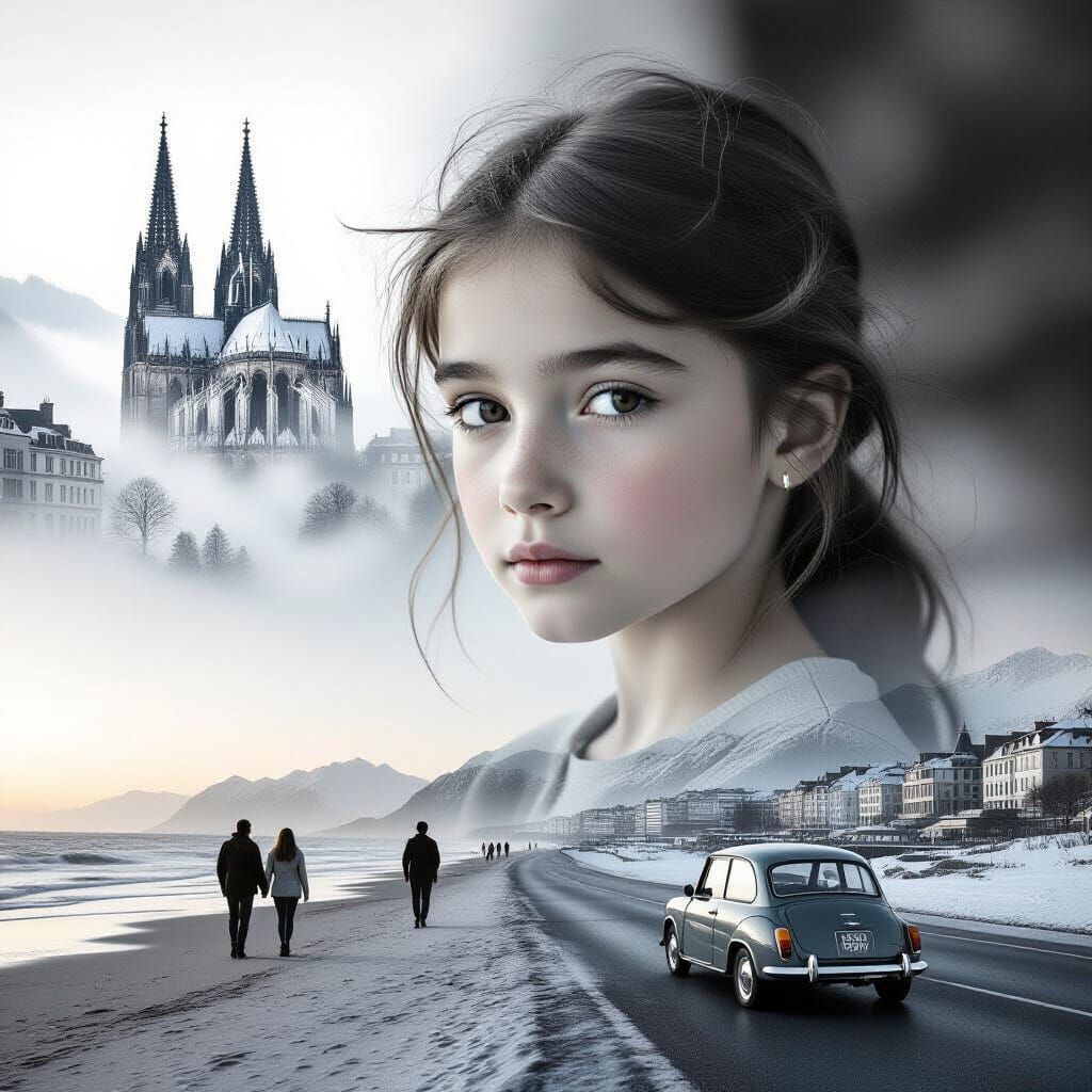 This image features a black and white double-exposure portrait of a young girl, blending her delicate features with evocative scenes like cathedrals, beaches, and mountains for a poetic, melancholic feel.