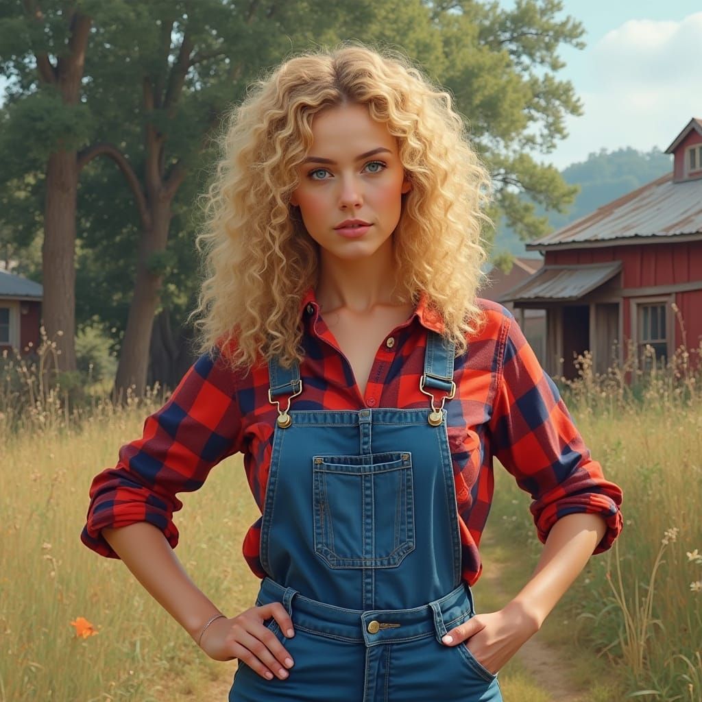 A digital painting of a woman with curly blonde hair in overalls and a red shirt, set in a rustic scene. The artwork features vibrant colors and expressive brushstrokes.