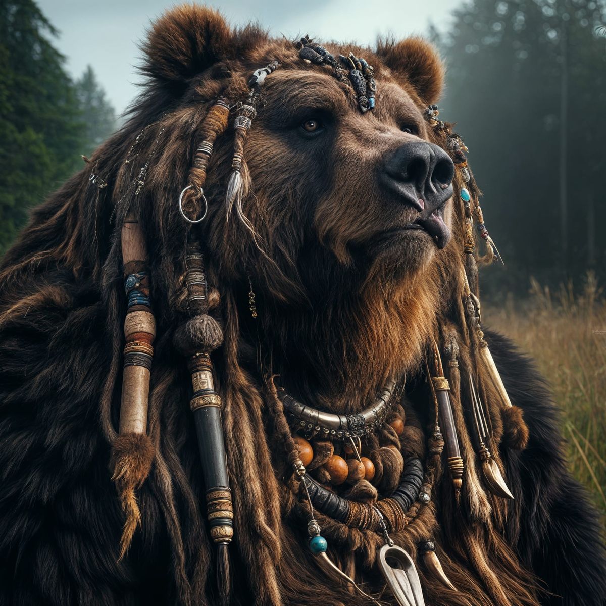 A full body photograph of a large Kodiak bear dressed as a tribal shaman. The bear has piercings and is wearing tribal fur clothing in this AI generated image.