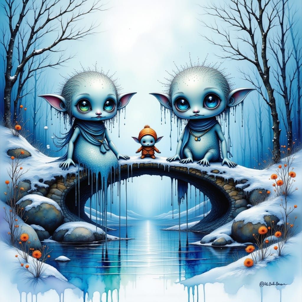 A whimsical and subtly eerie illustration of cute winter bridge trolls, rendered predominantly in ethereal blue hues with bursts of vibrant, fluid color. The trolls possess delicate, doll-like features with wide, expressive eyes that convey a disquieting innocence, their forms slightly twisted or elongated ...