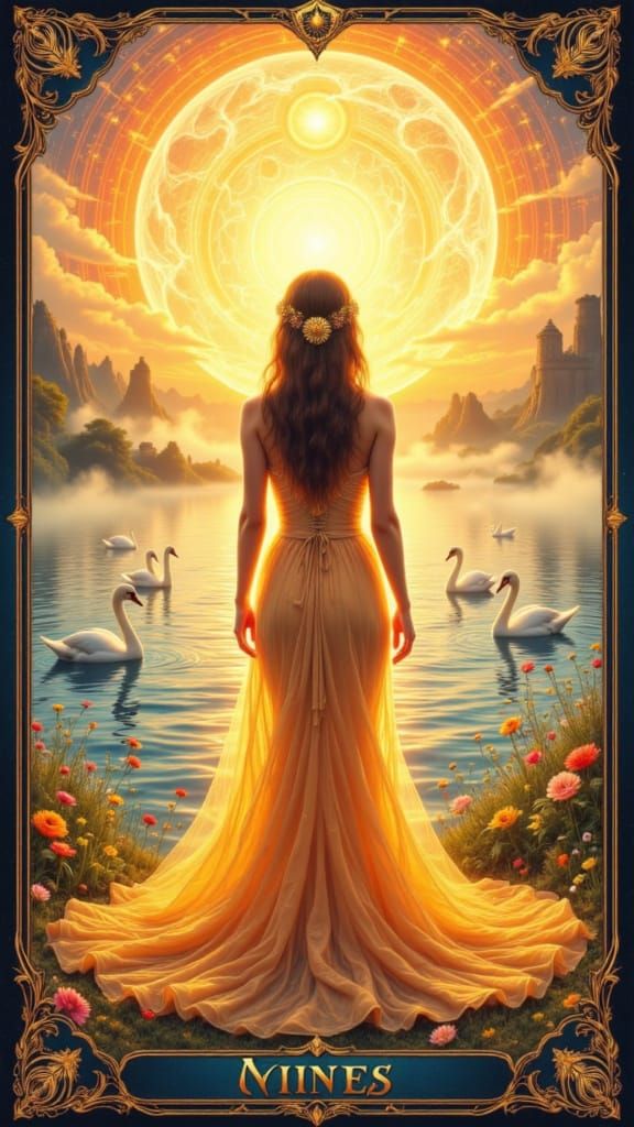 This image shows the goddess Aine standing in wildflowers at dawn beside a misty lake with ringforts and swans. It has an Art Nouveau style, golden tones, and a swirling sky.