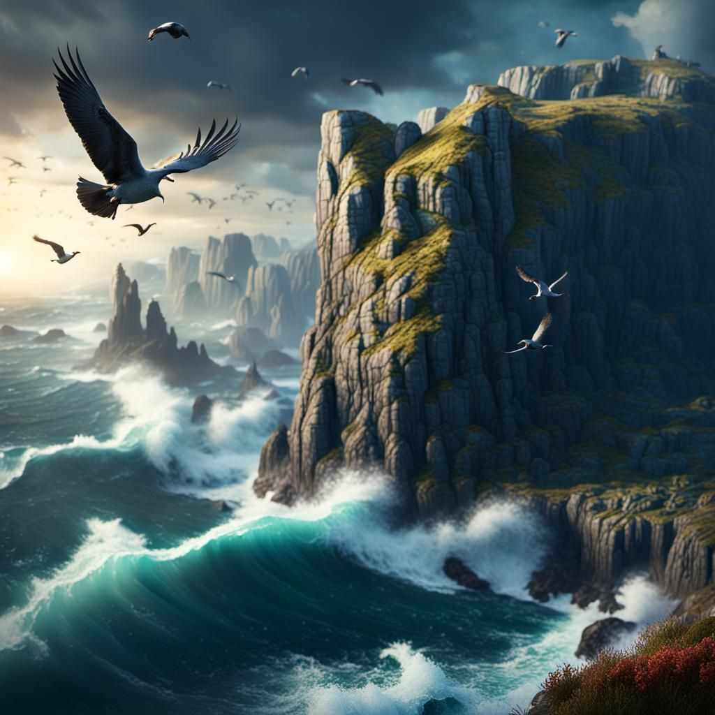 A dramatic view of cliffs overlooking the ocean. Waves crash below as birds fly above. The image is a detailed matte painting with complementary colors.