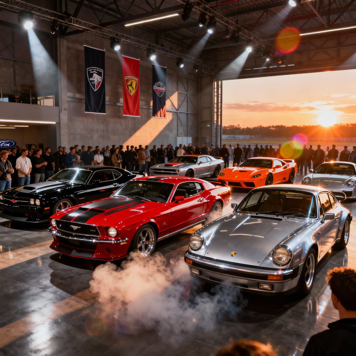 A cinematic HDR exhibition showcases iconic muscle and sports cars like Mustang and Camaro. Set in an industrial hall with spotlights, chrome, and sunset tones, this realistic image features a warm color palette.