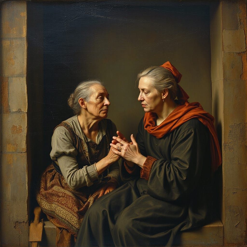 This image shows a distressed tactile abstraction of an abandoned woman being comforted. The artwork evokes the style of Pieter Bruegel the Elder, capturing a sense of human emotion.