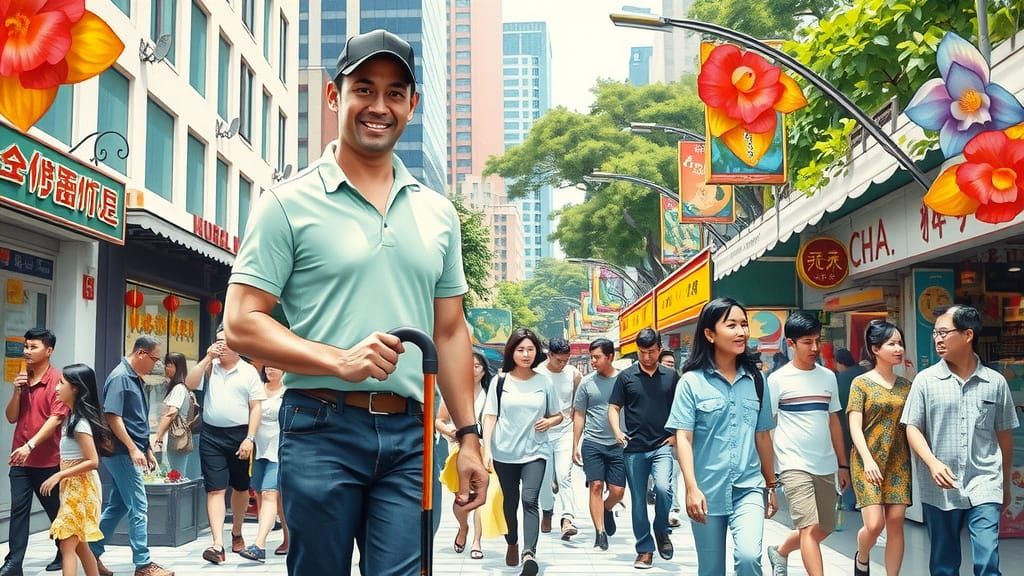 This image depicts a bustling city street in a soft, natural light, with a diverse group of people moving through the scene, surrounded by high-rise buildings, colorful signs, and lush trees, all captured in a masterful blend of muted and vibrant tones.