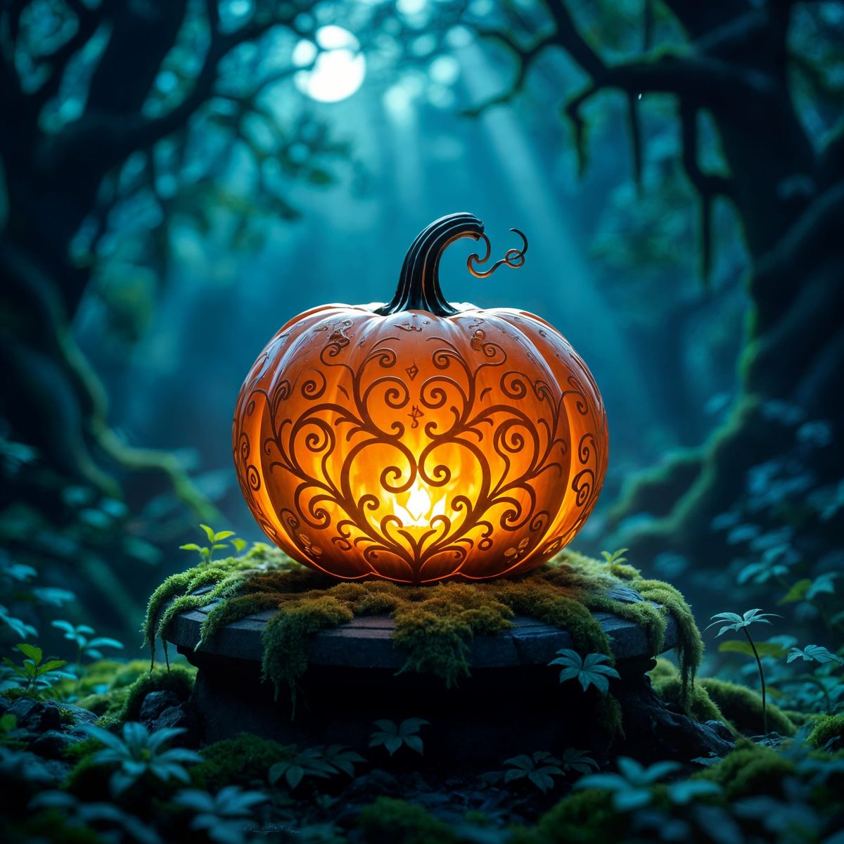 This image shows a detailed glass pumpkin with arcane symbols on a mossy pedestal in a magical forest. It features hyperrealistic textures and lighting, evoking dark fantasy concept art.
