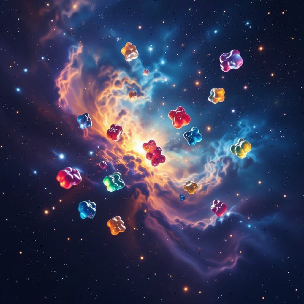 This image showcases gummy bears soaring through a cosmic nebula, inspired by Hubble and Spitzer Space Telescope imagery. Features volumetric lighting and rich blues and purples with iridescent highlights.