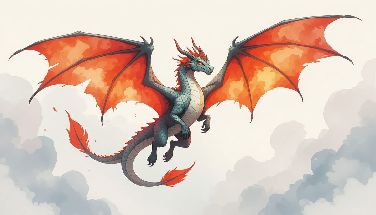 Mythical winged dragon in soaring flight, depicted in an epic watercolor vector style. Features vibrant red and orange watercolor washes suggesting fire and magic, isolated on a white background for fantasy designs.