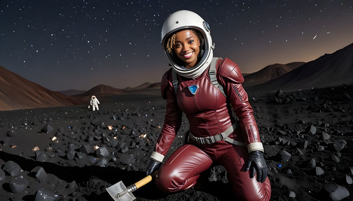 A realistic image of a smiling, blonde Ethiopian woman in a burgundy spacesuit digging for diamonds on a dark, volcanic planet at night in 8k resolution.