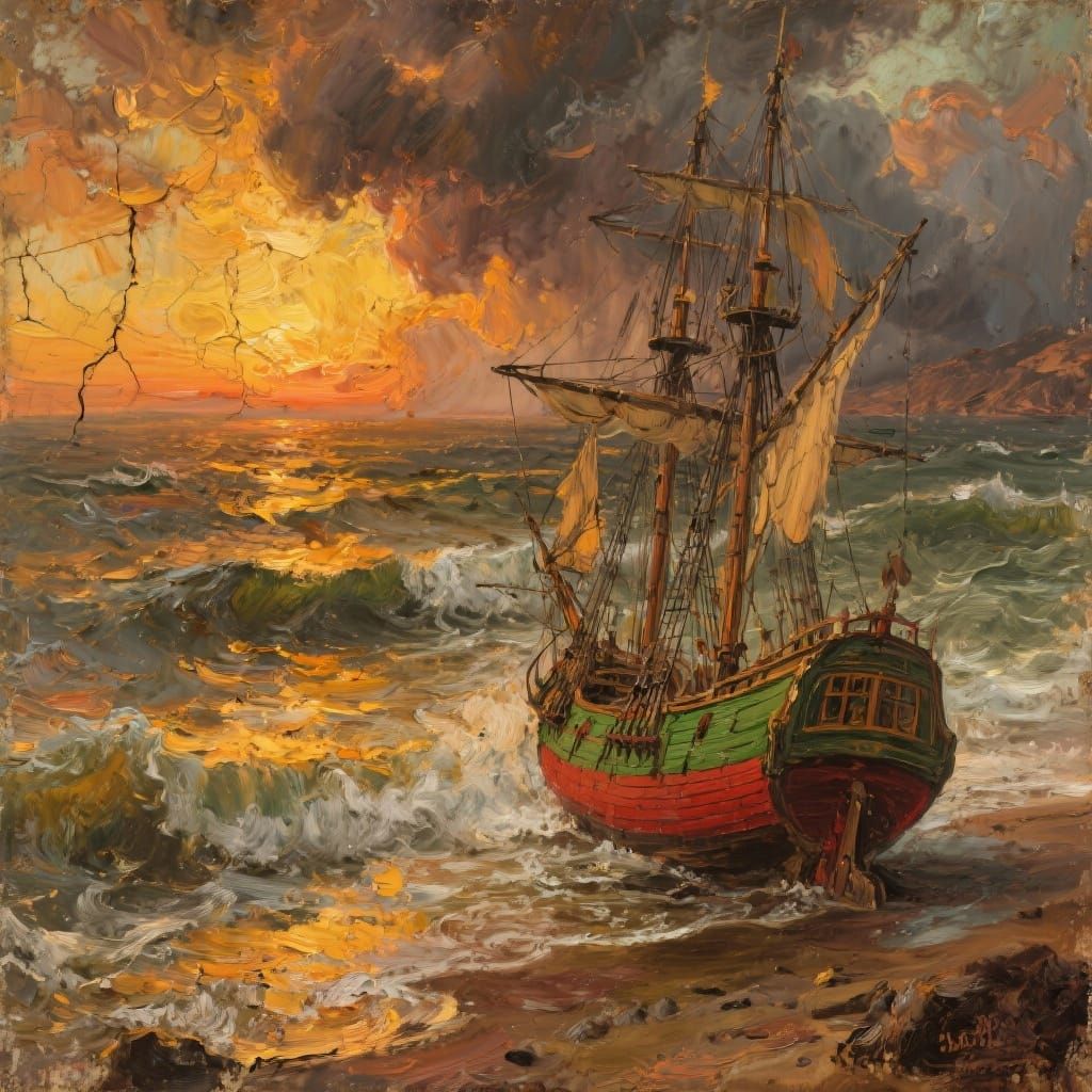 An oil painting on canvas, richly textured brushstrokes with visible layers of paint, depicting a dramatic seascape at sunset. Golden and orange light reflects on the waves, with a storm approaching on the horizon. In the foreground, a lone galleon sailing ship with green red wooden hull rests on the ...