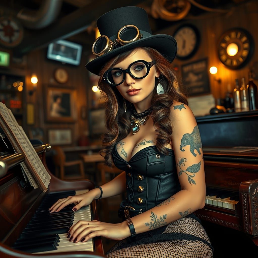 This image shows a charming steampunk woman playing the piano in a rustic western bar. She's dressed in elaborate steampunk attire with a focus on intricate details and nostalgic flair.