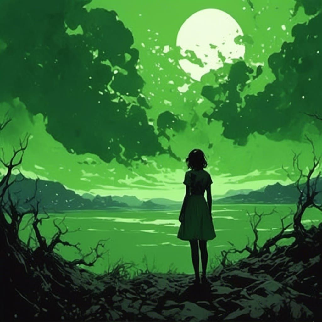 This image shows a beautiful woman standing in a desolate landscape. She is looking away from a portal revealing a vibrant, green world, framed by toxic clouds and soft lighting, with paint drop effects and intricate details.
