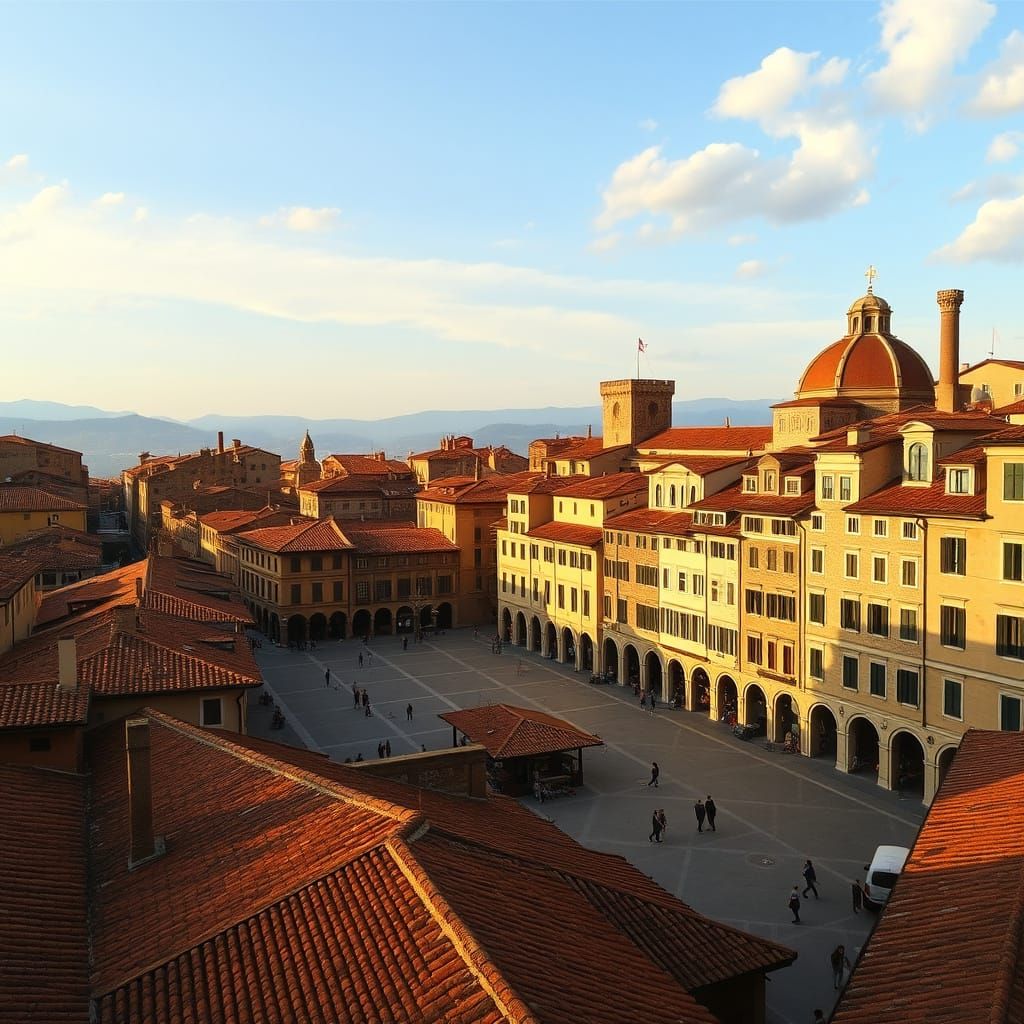 A captivating image showcasing Piazza del Campo in Siena. The scene features medieval Italian architecture under warm golden light, reminiscent of classic European paintings.