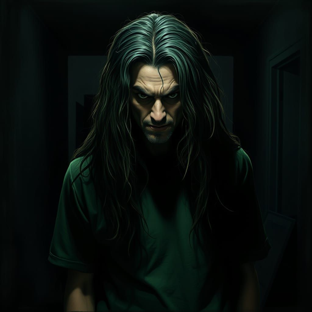 A striking picture of a mysterious figure with long hair and an unsettling smirk, standing in a dimly lit room. The image is reminiscent of dramatic digital art with intense shadows.