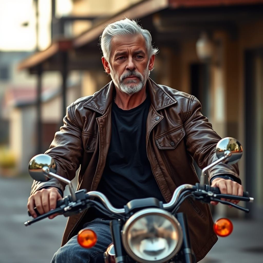 A realistic image of an older biker on a motorcycle. The biker has salt-and-pepper hair and wears a leather jacket and jeans, rendered with warm lighting and a gritty aesthetic.