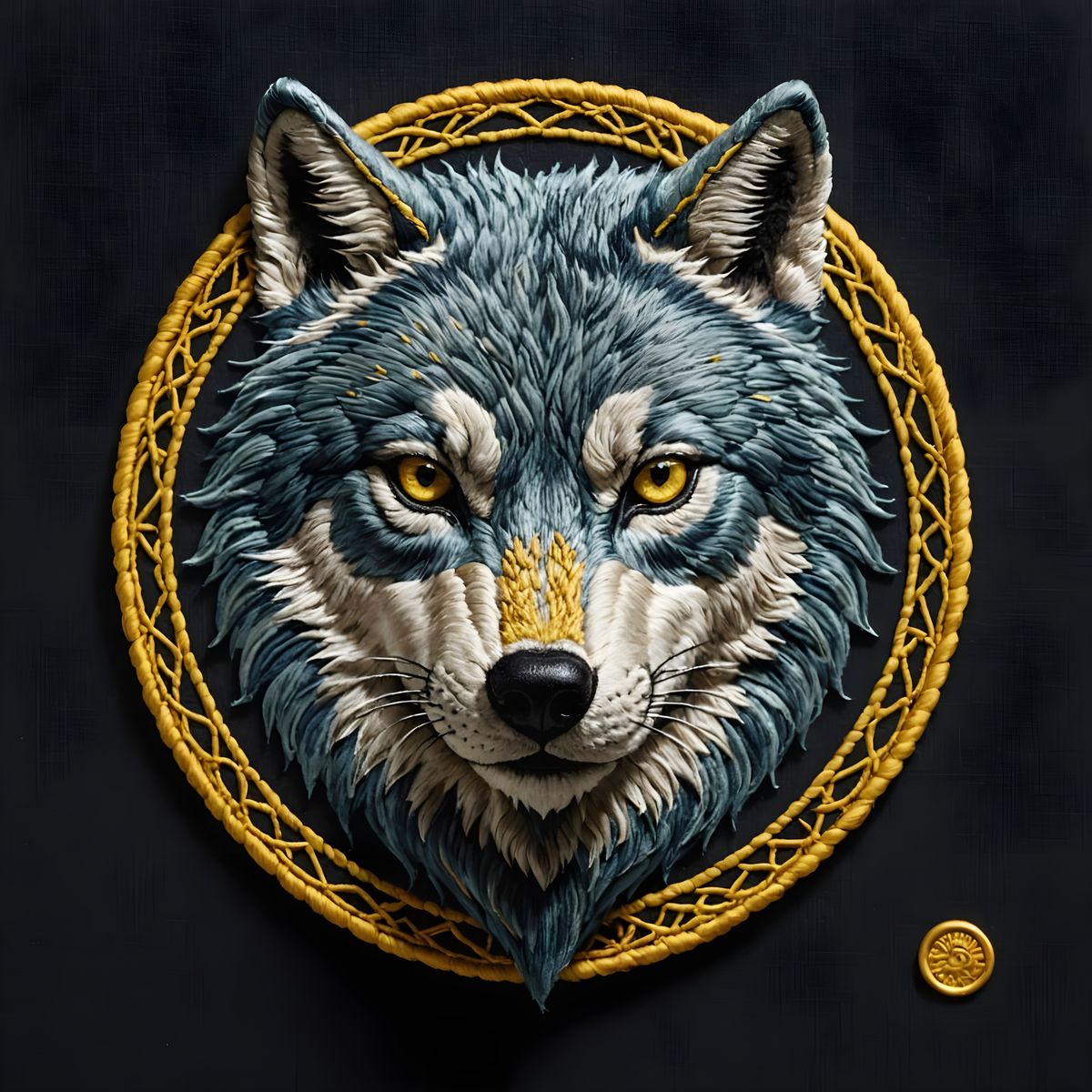 This image shows a thread embroidery of a wolf's head with a stylized moon on its forehead. The wolf features sharp, angular facial features and piercing yellow eyes, symbolizing strength.