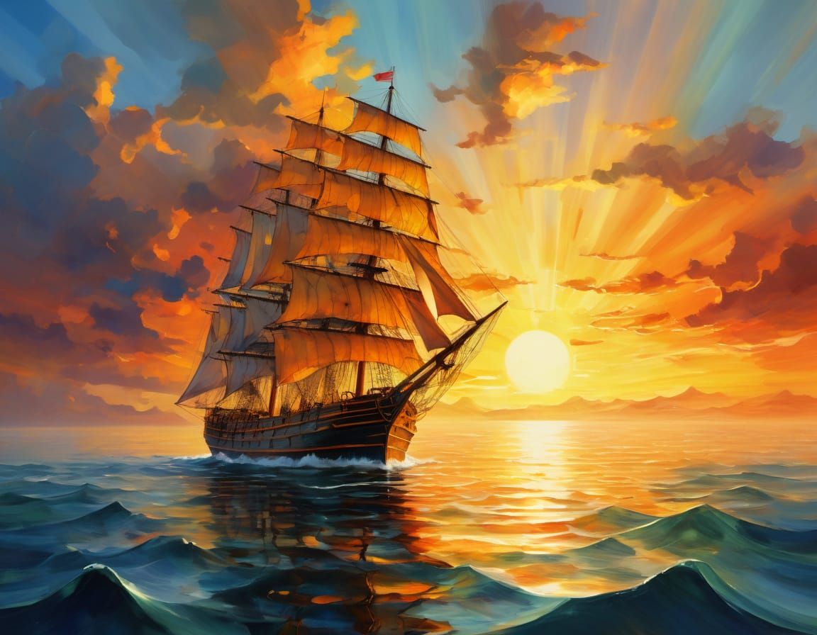 A striking picture of a tall ship sailing on open water during a sunset. The artwork features a stained glass aesthetic with warm colors and golden light reflecting on the water.