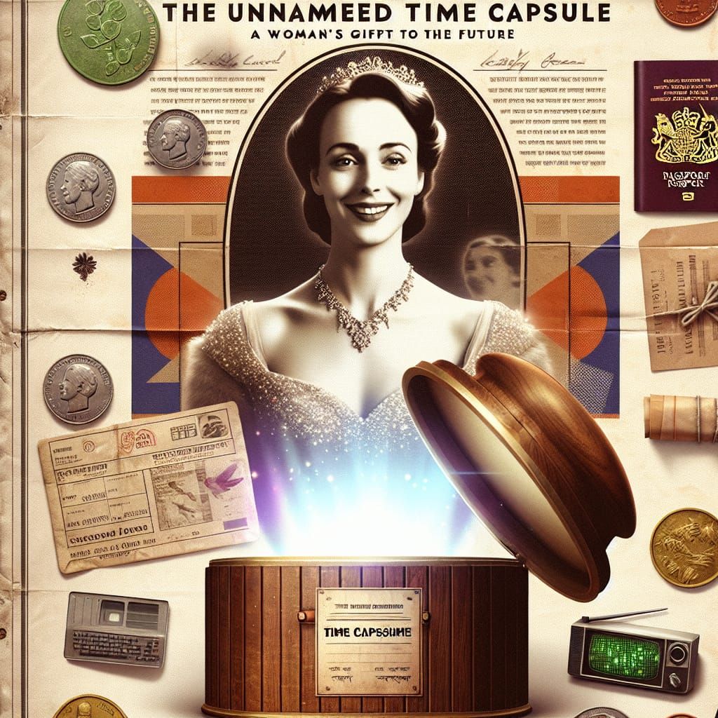 This image shows a vintage-style poster featuring a smiling woman and a time capsule opening to reveal a soft glow. Floating vintage items surround the capsule against an aged parchment background with royal accents.