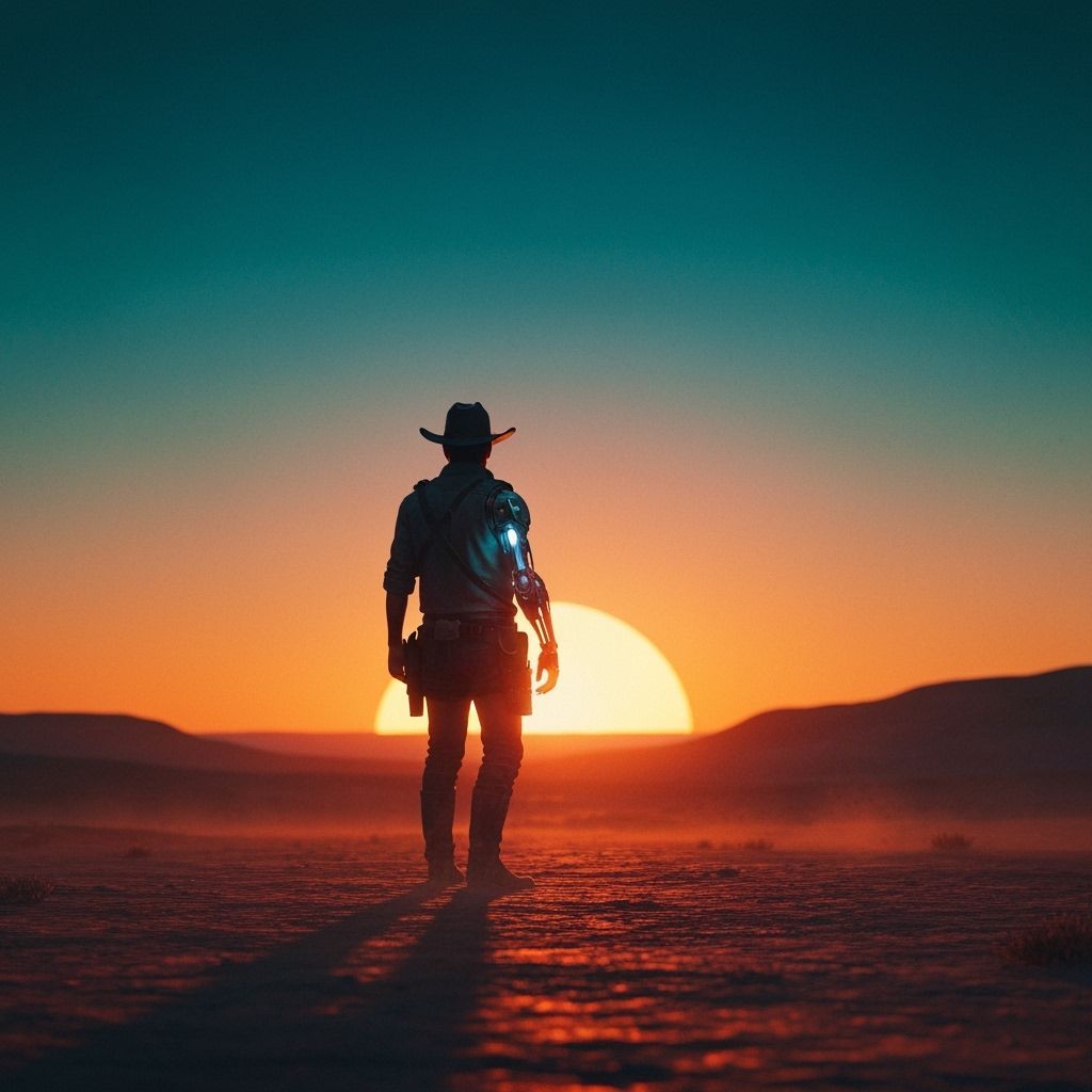 This image depicts a lone cowboy with a cybernetic arm silhouetted against a striking binary sunset on a dusty alien world. Rendered in a hyperrealistic, cinematic style with dramatic lighting.