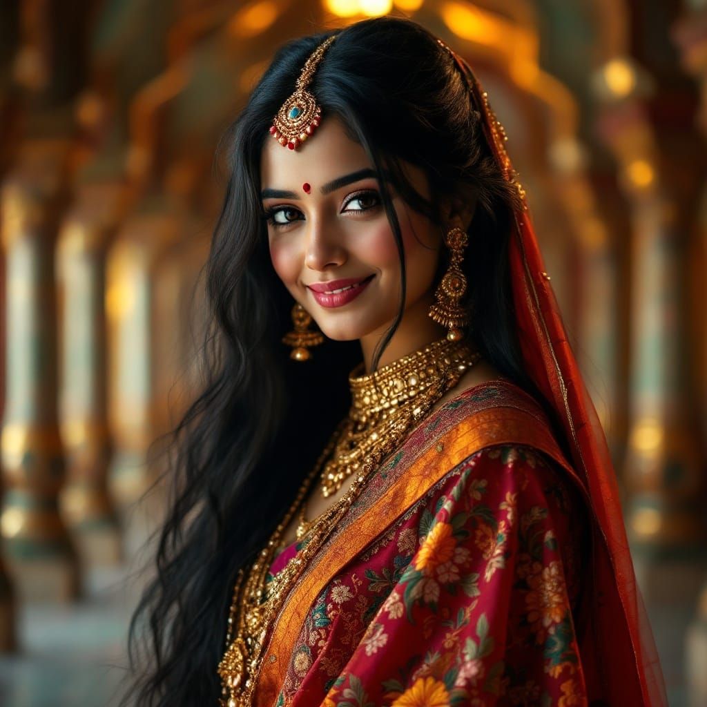 This image captures a vibrant Indian woman in traditional attire, surrounded by a soft, cinematic glow. Her joyful smile and sparkling eyes radiate warmth, set against a blurred palace backdrop, reminiscent of Indian digital art and cinematic lighting.