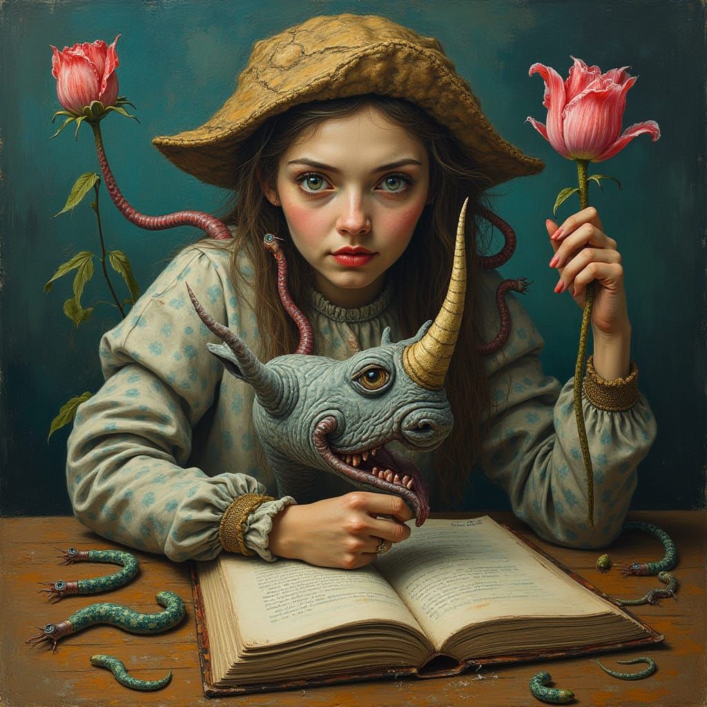 This image depicts a surreal, mutated woman and child in a Dürer and Van Gogh inspired style. It features a dissolving horse, a torn rhinoceros, and a vibrant tulip, rendered with rich impasto textures.
