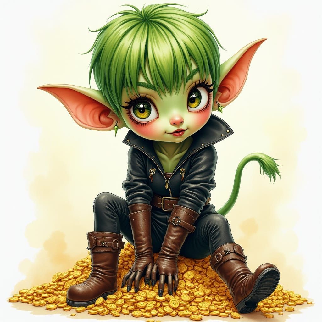 This vibrant watercolor painting depicts a joyful goblin rogue, dressed in a sleek leather outfit, sitting amidst a treasure trove of gold coins. The neo-impressionist style shines with intricate details and dynamic lighting, capturing the subject's carefree spirit.