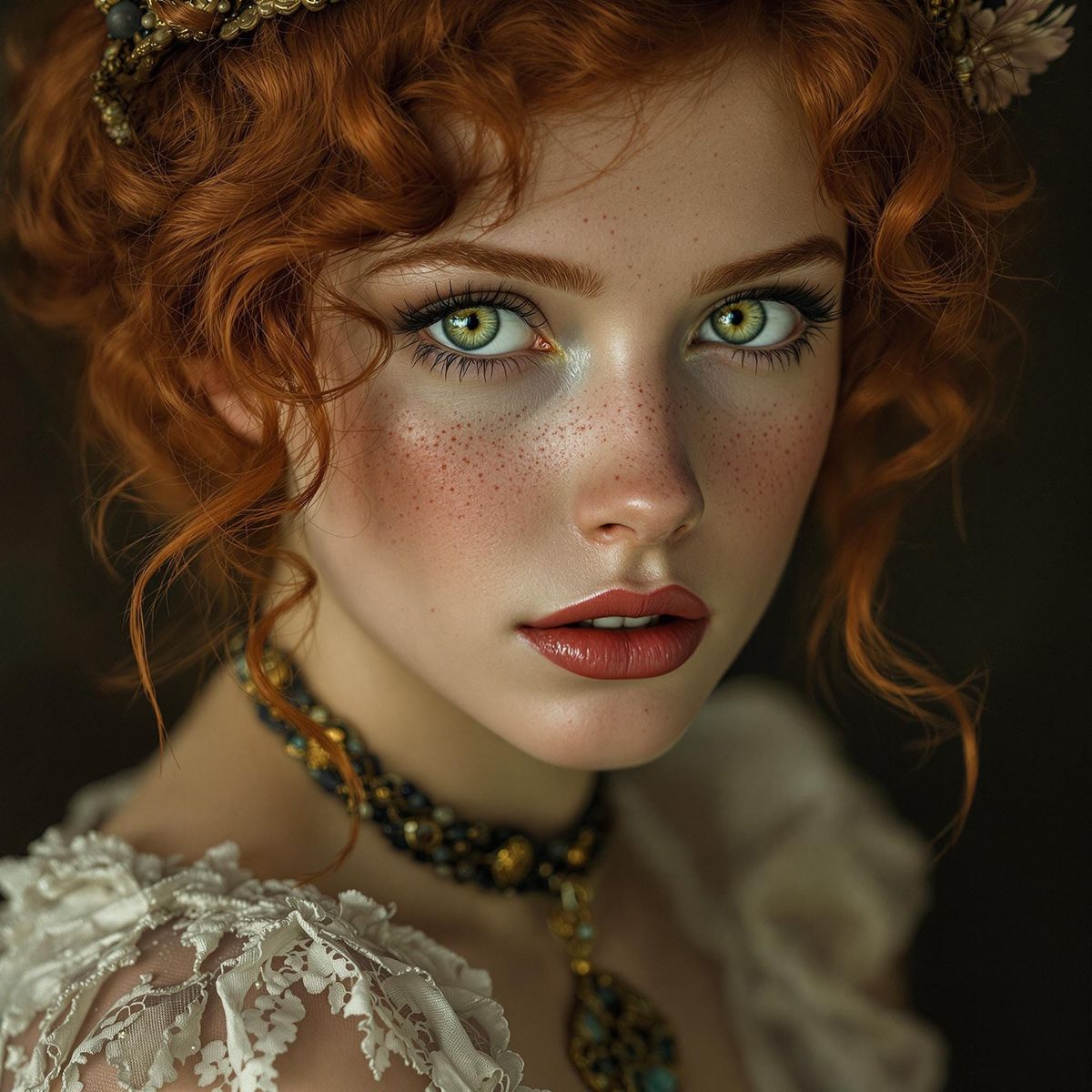 This image shows a stunning woman from the 1920s with fiery red hair and expressive green eyes, set against a backdrop of intricate details and high-end art deco flair.