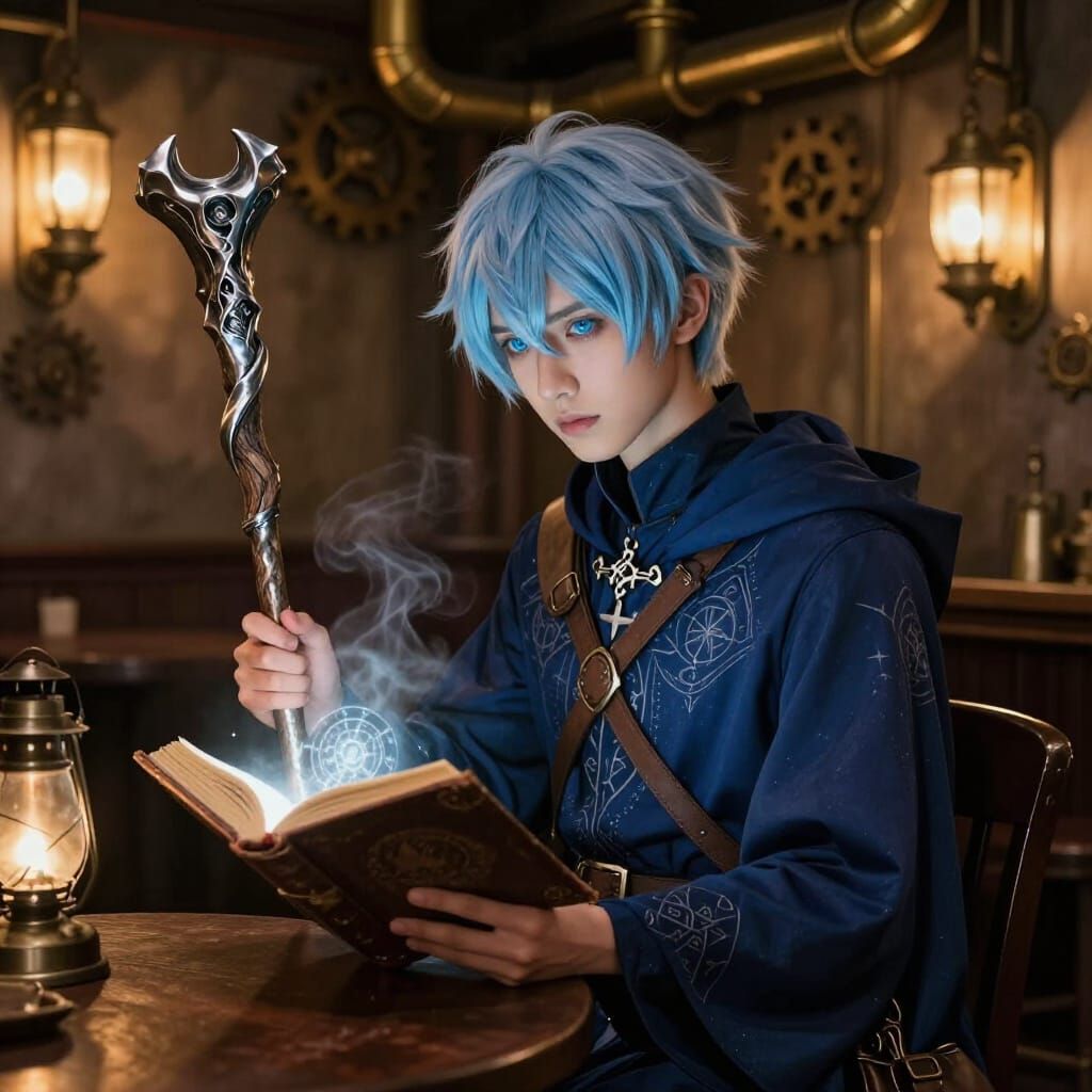 This image shows a young wizard with light blue hair reading a glowing grimoire in a steampunk-styled tavern. He is seated at a table, with a magical staff and satchel nearby.