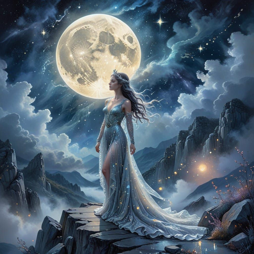 "pencil art. Full-body depiction of the Greek moon goddess Selene, standing gracefully on a mountaintop beneath a glowing full moon. She wears a flowing silver-white gown that glimmers with moonlight and a delicate lunar crown. Her long hair floats in the night breeze. A silver torch shines in her hand. The scene includes a star-filled sky with cosmic constellations, drifting clouds, ancient marble ruins, a shimmering celestial river flowing in the background, and ethereal light ..."