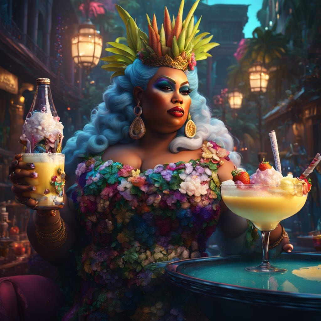 This image shows two drag queens enjoying a pinacolada. The detailed digital painting features deep, complementary colors and intricate details, rendered in 8k resolution.
