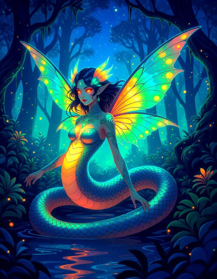 A vibrant illustration of a serpent-human hybrid in a magical forest. The artwork features glowing scales, wings, and ornate details with a neon color palette, creating a fantastical scene.