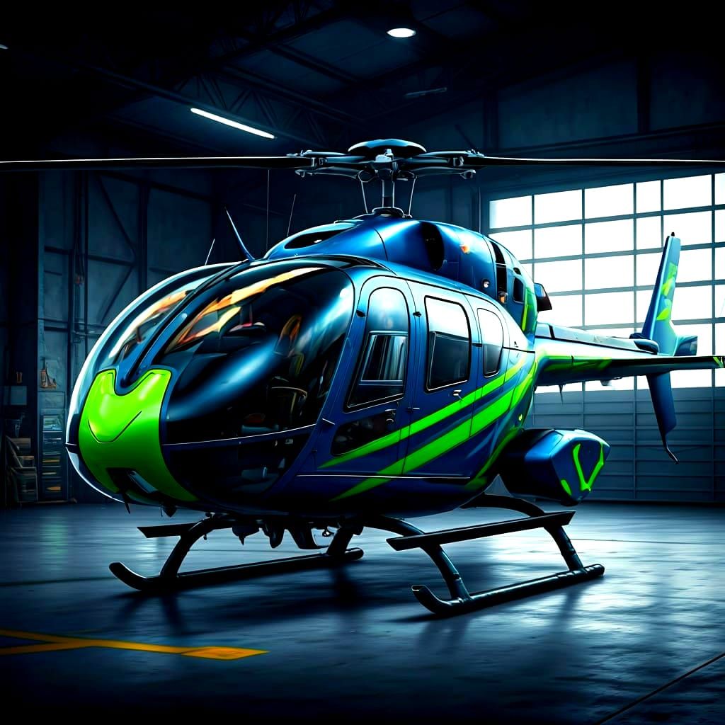 A sleek helicopter with a design that resembles a blend between machine and a hornet. It has a dark blue and neon green color scheme and cartoonish features, like hornet stripes, painted eyes on its windshield, and a stinger-like spike on its tail. The vehicle is parked in a large garage and is designed ...