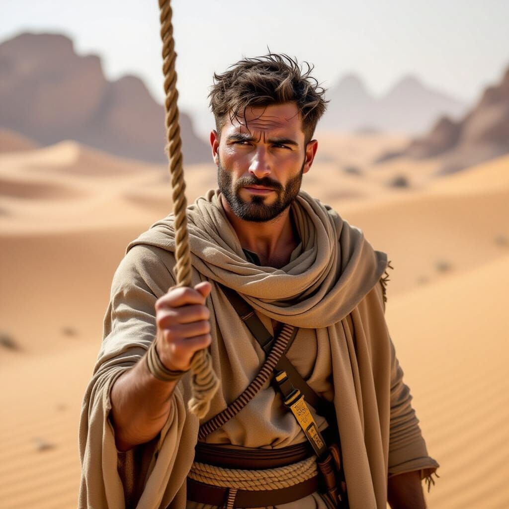 A wide shot of a Persian man in the 3rd century pulling a guard across endless dunes. He wears a worn tunic and cloak, with a knife at his belt, under a harsh midday sun.