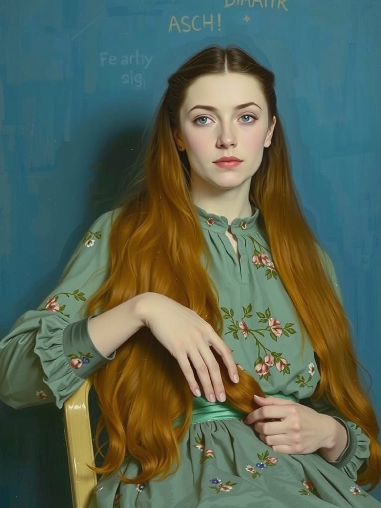 This image shows a beautiful woman with long golden hair, wearing a pale green-blue dress with delicate blueberry print, in a Pre-Raphaelite-inspired setting with soft light and delicate brushstrokes
