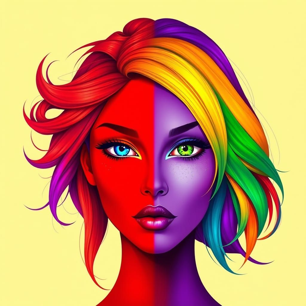 This image shows a stunning portrait of a woman's head, divided by a horizontal line between bold red and rich purple, with her rainbow-colored hair and contrasting eyes shining bright with inner light