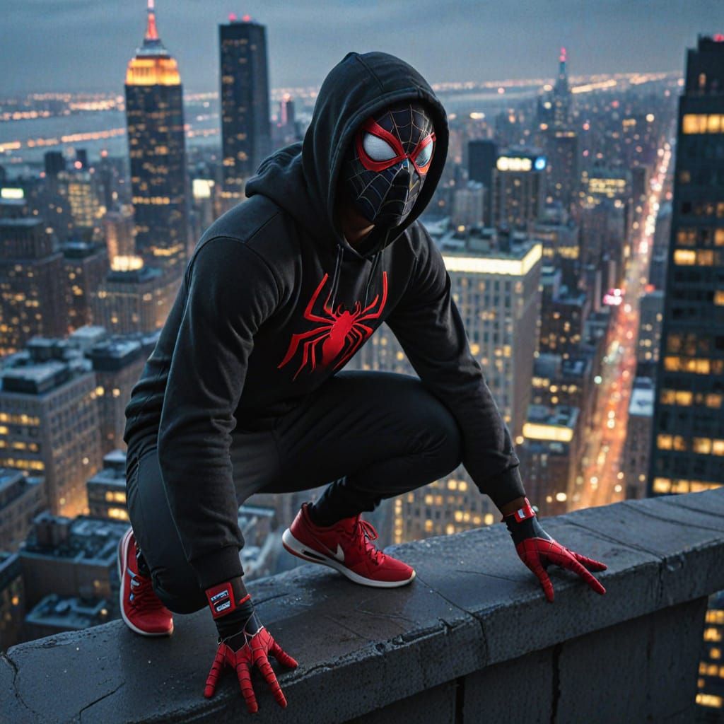 A hyperrealistic concept art of Miles Morales on a skyscraper ledge at night, wearing his Spider-Man suit with a hoodie and Jordans. Features dramatic shadows and vivid blues/purples.