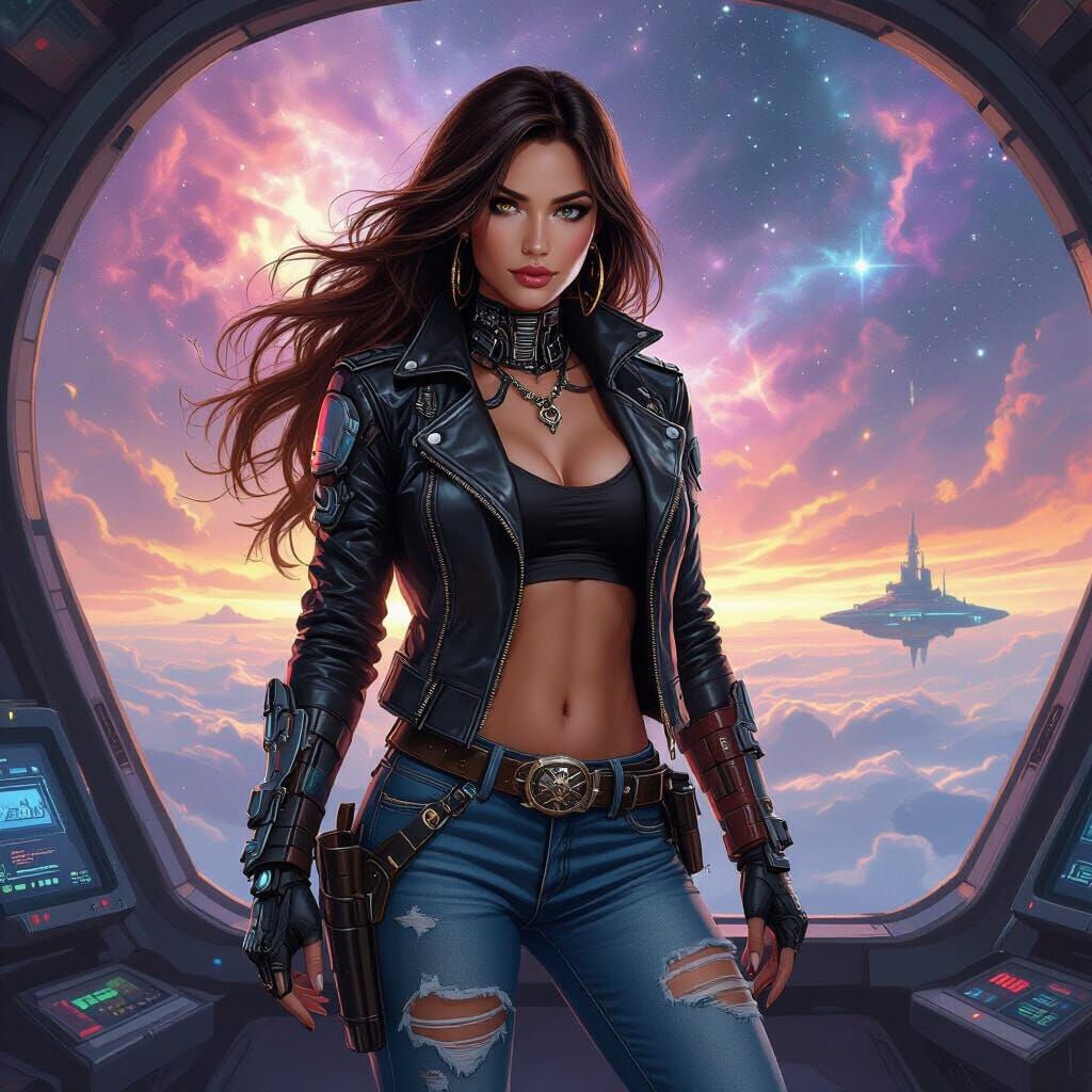 This image shows a beautiful space pirate queen standing on a starship bridge. She has cybernetic enhancements and is overlooking a nebula with vibrant colors and intricate details in a cosmic fantasy aesthetic.