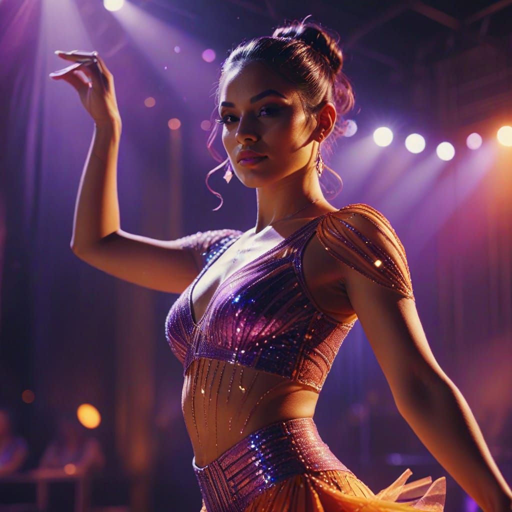 This image shows a latin dancer on a vibrant stage under dynamic lights. The dancer's sparkling costume stands out against a twilight backdrop, with a warm color scheme and double exposure effect.