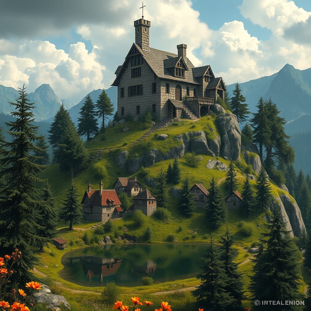 This image shows a detailed matte painting of an old stone cottage on a hill, with a village, pond, and pine trees. Rendered with deep, fantastical colors and intricate detail in a fantasy concept art style.