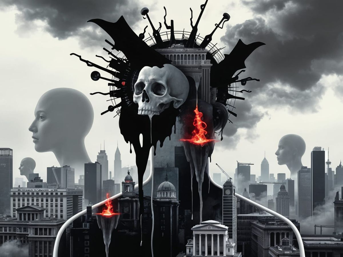 This image depicts a nightmarish, corrupted scene with visual interference and multiple layers. The artwork features dystopian collage patterns, suggesting mental destruction and a dying world.