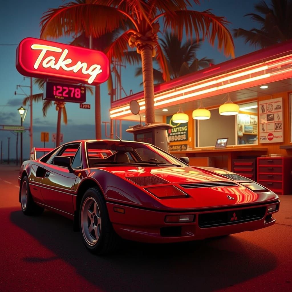 A Mitsubishi Lancer EVO 8 glows beneath a neon Tokyo sunset. Sleek rims and tires complement the retro workshop setting in this image with Kodachrome warmth.